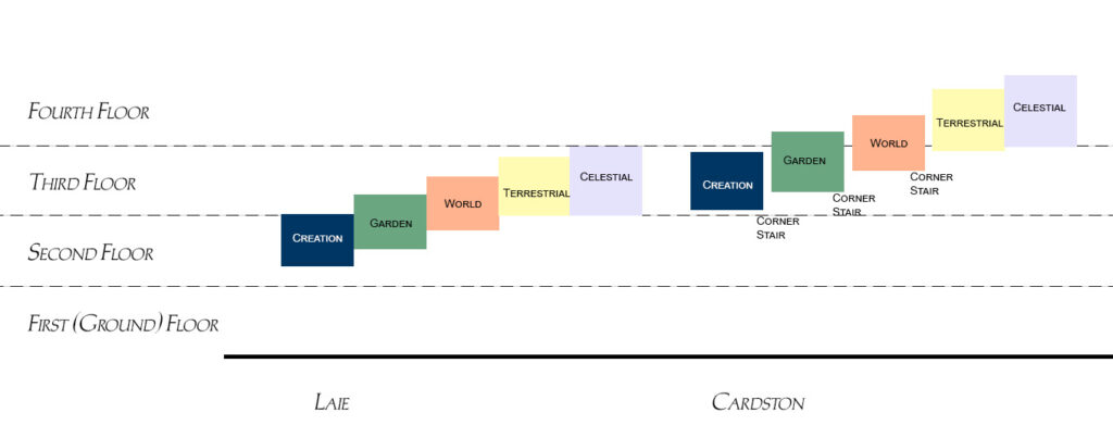 While very similar, the two plans are still different. The Laie temple has a central hallway that wraps around the celestial and baptistry, dividing those two rooms from the endowment rooms. The Cardston temple makes the rooms larger by having the rooms but up against the celestial, and fills the space between the four gables with stairs to go from room to room, as well as a stairway on each corner spanning the height of the whole temple.
