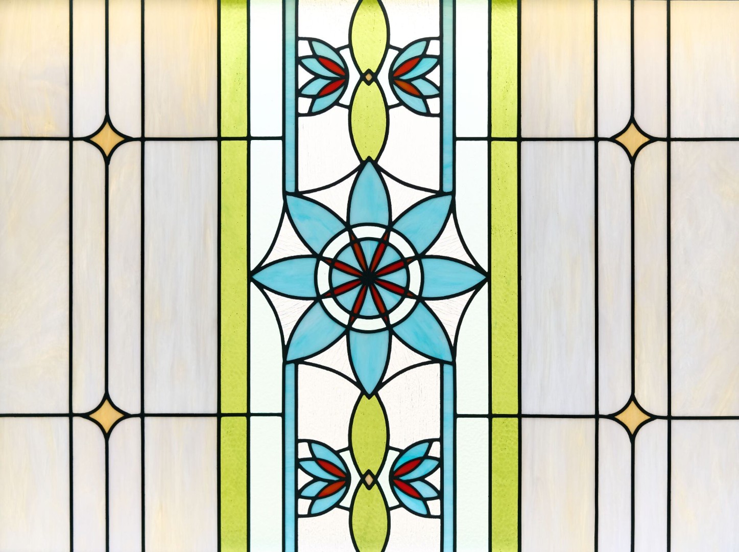 The art glass design is a stylized floral pattern, primarily of blues and greens consistent with the African lily (Agapanthus) flower.