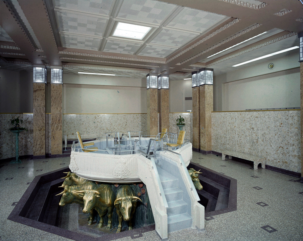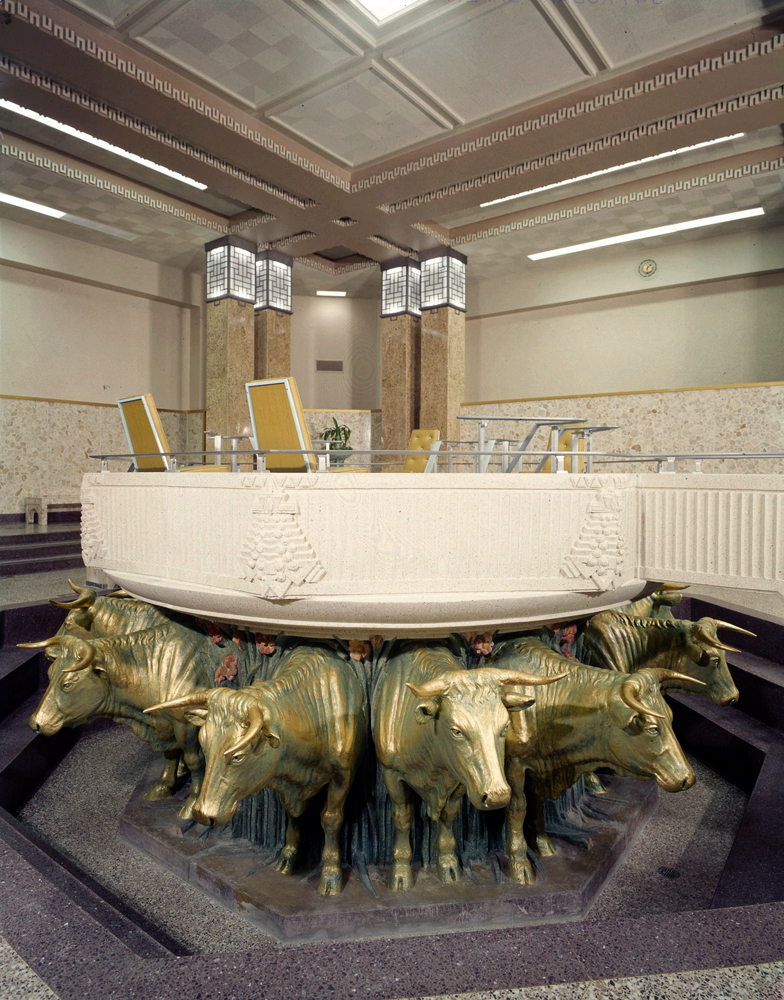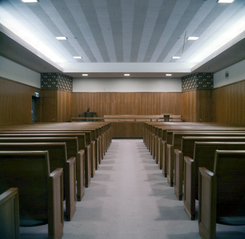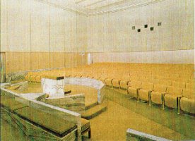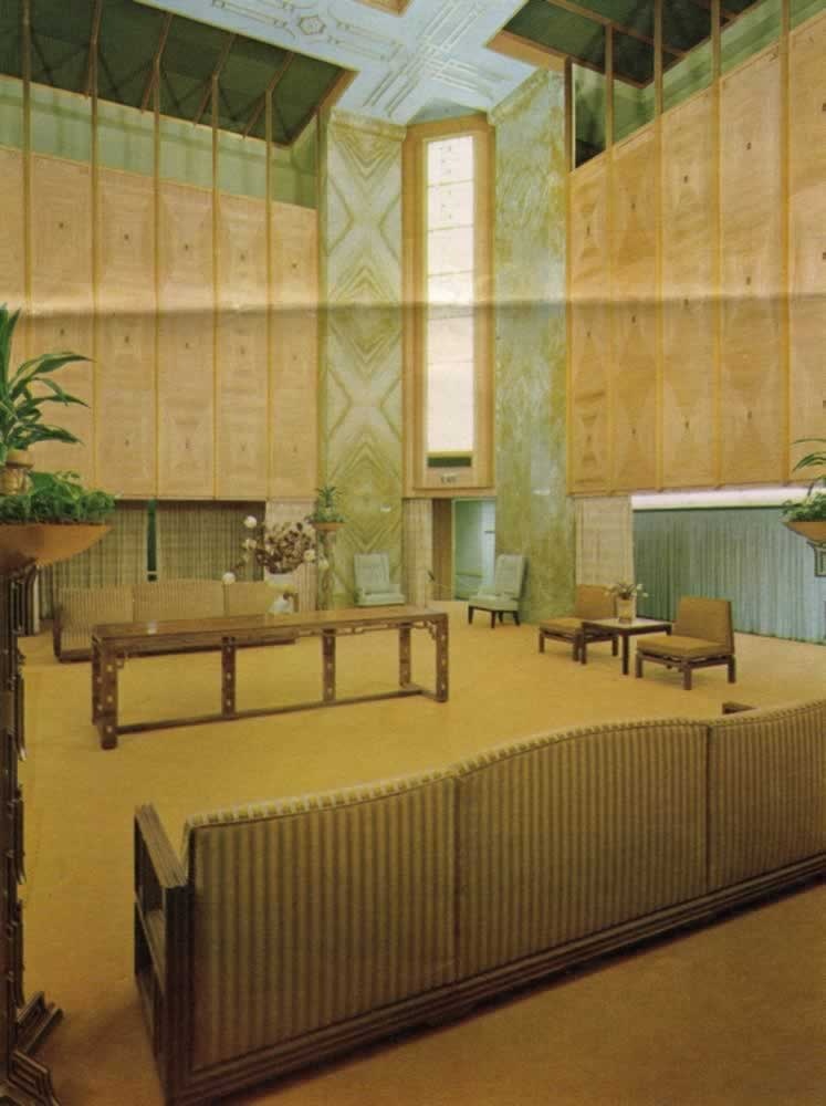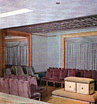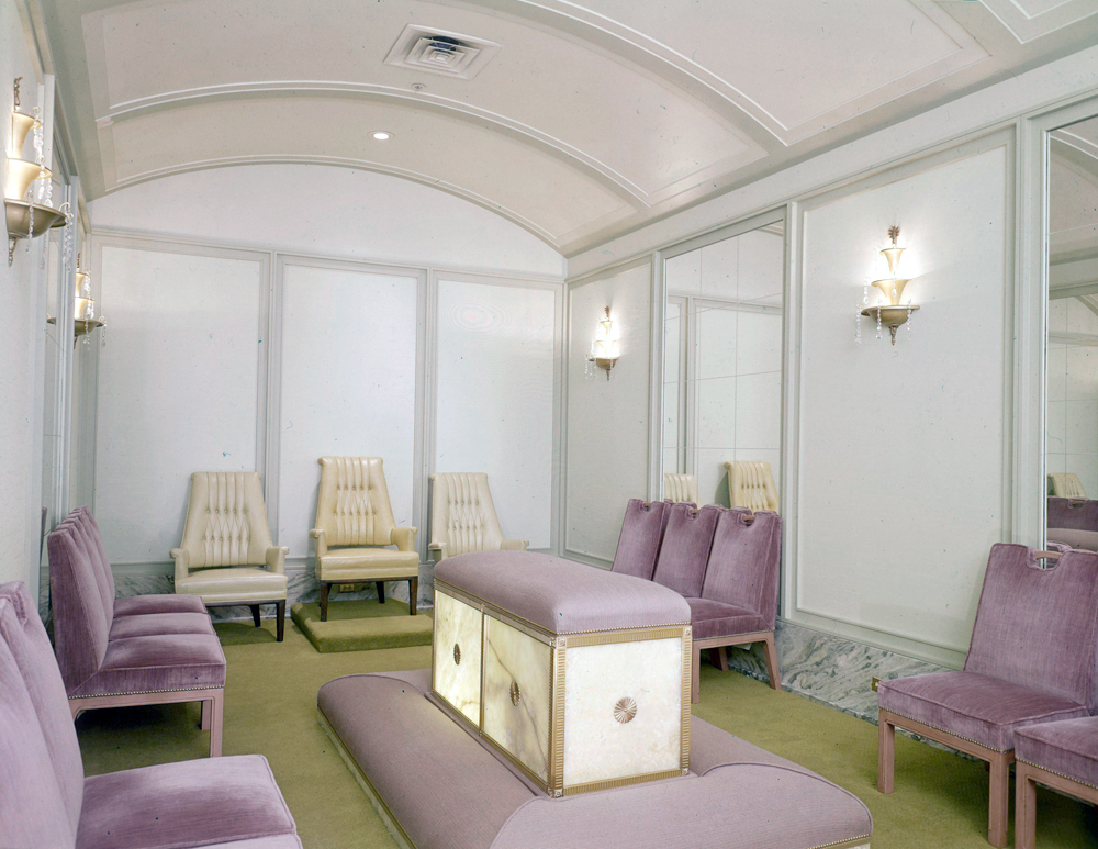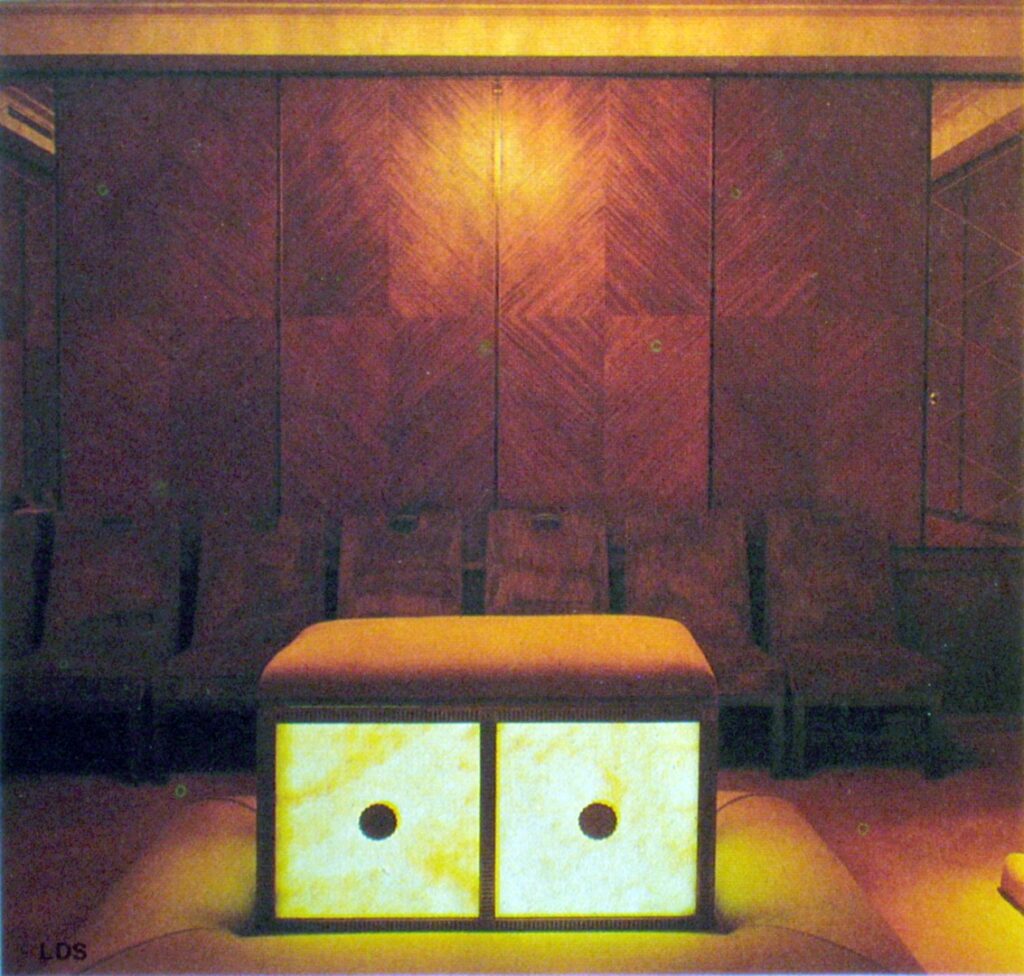 With the introduction of the new International temples, the endowment had begun to be presented in film format. This had allowed for a single room for the entire endowment ceremony. In the Oakland Temple this concept was taken one step further, and 2 separate rooms were provided. This allowed for sessions to be started every hour and 15 minutes in alternate rooms, instead of once every 2 and a half hours in a single or series of 4 progressive rooms. [32]Harold W. Burton and W. Aird Macdonald, “The Oakland Temple,” Improvement Era Vol 67, No. 5, p. 380, May 1964.(These two rooms would later be be increased to 4, thorugh take less used space to add rooms on the other 2 sides of the celestial.)