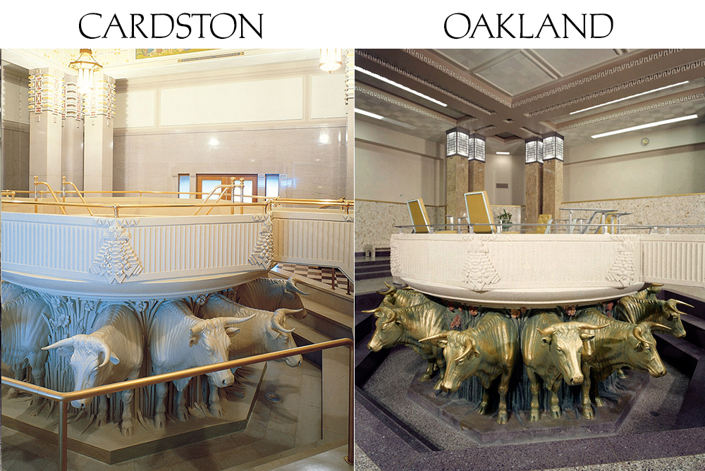 The Oakland California Temple was the first temple in the United States designed for film presentation of the endowment and the first temple to have more than one instruction room connected directly to a central celestial room. To simulate a progressive presentation, slide projectors were used to shine photographic murals on the walls representing the various stages of the endowment. Later, indirect lighting was used to symbolize the transition from one stage to another.