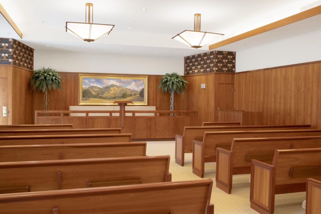 The Oakland California Temple was originally built with two auditorium-style instruction rooms each seating 200 persons for film presentation of the endowment. In 1990, two smaller instruction rooms were created from the second-floor sealing rooms. (In 2019, center aisles were added and seating capacity was reduced to improve the functionality of those spaces.)