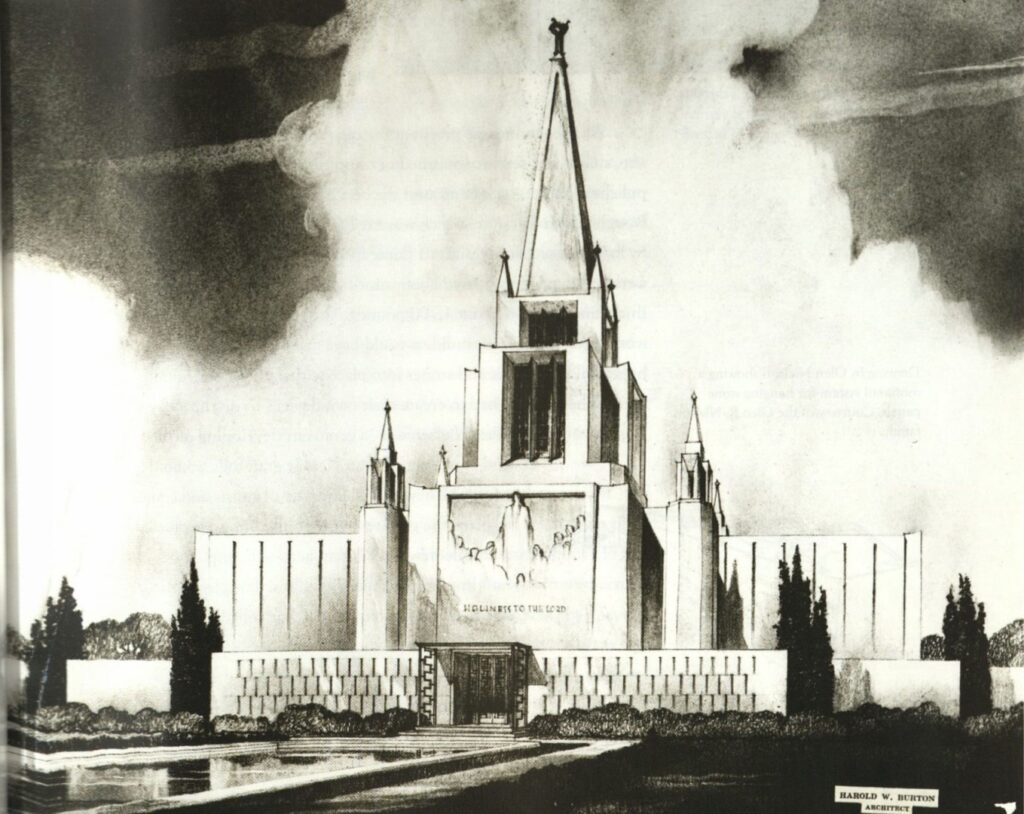 The same edition of the Improvement Era that proclaimed the announcement had a preliminary render of the temple. While similar in design to the final temple. Notably, it has windows in the tower, where the finished temple would not have any windows until the 2016 renovation. Also the render was missing the temple wings that would form the sides of the courtyard on the finished temple