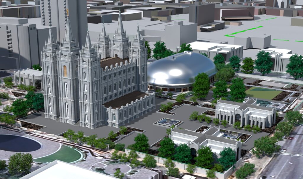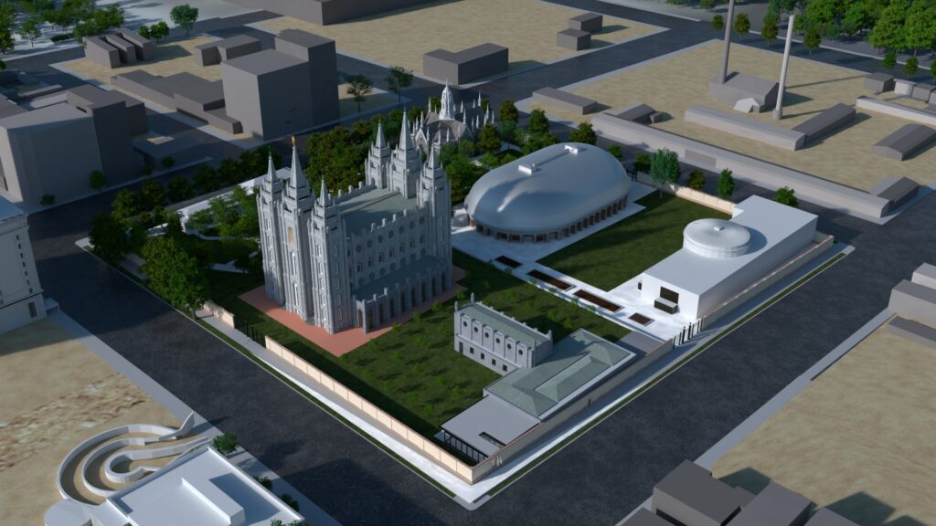 112 Aerial view of Temple Square, Salt Lake City, Church History Library, retrieved 23 September 2025. https://catalog.churchofjesuschrist.org/record/82acc680-9cf9-4321-847d-26869f1ec584/0?view=browse